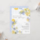 The design features hand-painted lemons, citrus leaves, pastel blue florals, golden yellow flowers, and intricate ceramic-style tile patterns — creating a beautifully coordinated lemon bridal shower aesthetic. Ideal for brides who love citrus themes, Amalfi Coast vibes, coastal wedding décor, and bold yet elegant floral designs.