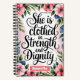 A watercolor illustration with a floral border. Inside the border, there's bold calligraphy text that says "She is clothed in strength and dignity Proverbs 31:25 ". The text is in an elegant style. The background is a soft pink.