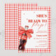 Celebrate your baby shower with this “She Is Ready to Pop” invitation designed in vibrant red tones with a playful soda pop illustration, gingham background, and coquette bow details. Perfect for a bold yet preppy baby shower theme, this invitation coordinates beautifully with the full soda pop collection.