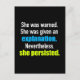 She was warned. She was given an explanation. Nevertheless, she persisted. A strong quote supporting Elizabeth Warren and her efforts to let democrats voices be heard in the senate. Never stop believing in progress.