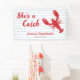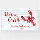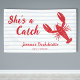 Celebrate your bride-to-be with this “She’s a Catch” lobster bachelorette party banner. Designed with a bold red lobster illustration, light blue and white stripes, this banner brings playful coastal charm to your celebration. The handwritten-style font adds a fun, casual look that feels personal and festive.