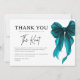 The minimalist turquoise-and-white design reflects today’s most popular bow-themed and modern bridal aesthetics, making it easy to coordinate with your shower décor, invitations, signage, and tableware. Thoughtfully styled and easy to personalize, this thank you card feels refined, heartfelt, and effortlessly elegant.