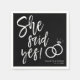 A fun and unique solid black with white script napkin tailored specifically to your future engagement dinner or party. It features the words "She Said Yes!" with wedding rings beside it. Underneath this and above it are the names of the bride and groom and the engagement or wedding date.