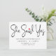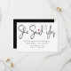 Modern minimalist black she said yes script save the date card. This elegant card features of handwritten script in black color with cute red heart above ''she said yes'' text on white background and wedding details and names written in capital lettering in black color. Back of the card is deep black. To edit this template click customize further.