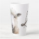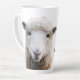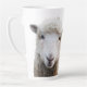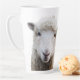 Cute lamb face tall mug. Looking out from this tall, white latte mug the sweet face of a sheep. Makes a nice gift for a sheep farmer, wool collector, and fibre artist. The mug also comes in a shorter size.