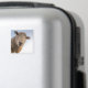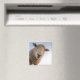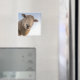 Photograph of a sheep as seen from below with it's head and face looking downward from the left corner of the magnet.