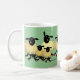 A lot of cute cartoon black and white sheep on a green mug. Change the colour of the background to personalise it to suit your taste.