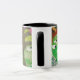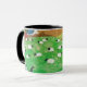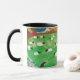A white mug with black handle and rim and a handpainted paper collage design of sheep.