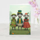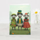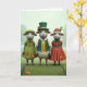 This card shows three anthropomorphic sheep standing close together in a soft countryside scene, their shoulders nearly touching as if they’re sharing a private joke 💚. Behind them, green fields fade into misty, distant trees under gentle daylight, giving the setting a calm spring-afternoon look. The sheep on the left wears a lime-green dress dotted with large orange-red flowers and a snug matching cap, leaning slightly toward the center. The taller middle sheep looks neatly dressed in a white shirt with a bright yellow waistcoat and a deep emerald vest, topped with a tall hat decorated with an orange sunflower ☘️. On the right, the third sheep wears a terracotta dress sprinkled with tiny yellow and green florets and a red hat with a small green sprig, smiling toward the others with wide dark eyes. Any text sits near the top in a medium green color, leaving the trio as the main focus below. In the foreground, a soft blur of scattered orange wildflowers frames their hooves and adds depth to the scene.