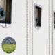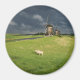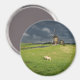 Round photo magnet with some sheep in the green grass in front of three windmills under a dark sky with rain clouds just before a spring storm in a landscape in Leidschendam, the Netherlands.