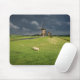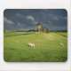 Photo mousepad with some sheep in the green grass in front of three windmills under a dark sky with rain clouds just before a spring storm in a landscape in Leidschendam, the Netherlands.