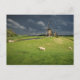 Photo postcard of some sheep in the green grass in front of three windmills under a dark sky with rain clouds just before a spring storm in a landscape in Leidschendam, the Netherlands.
