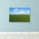 Sheeps in a row walking on a green grass and blue sky in the background wrapped canvas print.
