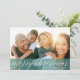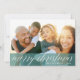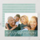 Simple and chic holiday photo card features your favourite family photo overlaid with a sheer spruce green band along the bottom. "Merry Christmas" appears in white modern calligraphy script lettering with your family name or names and the year at the lower right. Cards reverse to a variegated stripe pattern in pale sage green.