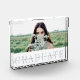 Modern graduation photo block features your favorite landscape oriented or horizontal photo on the front, with "graduate" displayed beneath in elegant gray-blue lettering. Personalize with your name, school and graduation year on a sheer white stripe overlay.