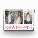 Modern graduation photo block features three of your favourite photos aligned side by side, with "graduate" displayed beneath in elegant bright pink lettering for a chic pop of colour. Personalise with your name, school and graduation year on a sheer white stripe overlay.