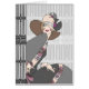 Shelby is seated in front of and next to a beautiful set of art deco ironwork fences. She wears a simple hat, pulled down over one eye, and a colourful dress and jacket with matching jewellery.