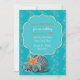 A marine Save the Date Announcement with a tropical flair. The blue-green abstract background is overlaid with a blue flourish that holds your information and is embellished with a collection of seashells and an orange star fish. The card is easy to customise with your wording, font, font colour and choice of six paper types.