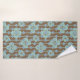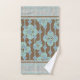 Shell We? Bath Towel Set. Colourful blue teal, purple, and brown. Accenting the set is cross currents in Teal Blue, grey, and pink. Ocean, seashore, nautical, beach house inspired bathroom decor.