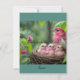 Beneath a gentle curtain of rain, a mother Rose-breasted Grosbeak stands sentinel over her fragile nest. Her vivid pink-red chest glows against the lush green forest, wings shielding three tiny chicks nestled in a woven cradle of twigs. The scene breathes warmth—raindrops glistening on nearby leaves, a magenta flower nodding softly above them. Every detail speaks of devotion, resilience, and the quiet poetry of nature. In this moment, the forest hums with life, and the bond between mother and young is as unyielding as it is tender—an intimate portrait of love beneath the storm.