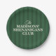 The rim is framed by a pattern of classic vintage green stripes, creating a nostalgic, sporting club aesthetic. In the center, the design gets personal with bold typography reading "The Your Name's Shenanigans." Whether you are hosting a sit-down family dinner or a backyard bash, these plates ensure that your party theme is served up with every slice of soda bread.