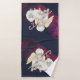 Bathroom towel set designed with a sweet angel with yellow wings holding a shepherds crook. Sitting with white fluffy lambs. Navy blue and burgundy watercolor background, with tiny flecks of faux gold sparkle glitter (not actual glitter just a printed image).