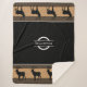 This warm and cosy Sherpa blanket is shown in a Black with chocolate brown, tan, charcoal and grey printed border on each end. Yellowstone text in centre with logo and several elk walking across the borders complete the look.
