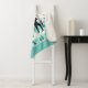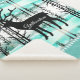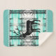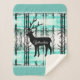 This warm and cosy Sherpa blanket is shown in a pretty forest Yellowstone Deer print with details of smaller sized lodge-style tree images along the solid colour aqua coloured border with grey accent stripes.