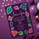 This trendy "she's a gem" kids birthday invitation features jewel-toned colours with crystals and gemstones. The reverse side features a pattern of twinkling gold stars. Personalise it for your needs. You can find matching products at my store.