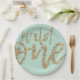 These adorable wild one plates feature gold, sparkle script on a light teal background. These are the perfect first birthday party decor.