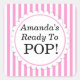 She's Ready to Pop Baby Shower Sticker with stripes. Customise with the mother-to-be's name! Perfect for baby shower favours, treats, and more.