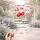 A clear, transparent background, decorated with a pink bow with cherries and pink flowers. Personalise and add a name and party details. Text: She's the Cherry on top