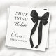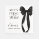 Party napkins designed with a classic black bow motif and the phrase shes tying the knot. Created for a clean, elegant look that pairs well with black and white wedding decor. Suitable for bridal showers, engagement parties, bachelorette gatherings, and wedding celebrations. Fully customizable text with a print-ready design for cocktail or luncheon napkins.