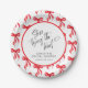 She's Tying the Knot Personalised Bridal Shower Paper Plates in a Red + White Palette. Elegant hand calligraphy style script with a cute all-over watercolor bow pattern. Simply personalise the template with your event title and date. © Kimbellished, LLC