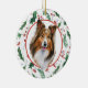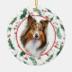On the front of this Holiday ornament is a beautiful portrait of a Shetland Sheepdog. The portrait is placed within a pretty green holly leaf and red berry pattern circular frame. The back of the ornament has the same background and circle with your custom text in matching red and green.