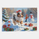 A cheerful Shetland Sheepdog runs playfully through the snowy winter scene, wearing a festive red Christmas hat. This delightful design highlights the breed’s fluffy coat, intelligent eyes, and lively personality while capturing the warmth and joy of the holiday season. A heartwarming winter moment full of festive charm.