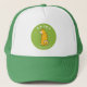 Trucker hat with an illustration and design of a Shiba, sitting upon a yellowish green background.