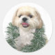 Shih Tzu in green garland with her tongue out in anticipation of Christmas