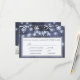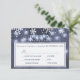 Editable text wedding RSVP with menu options featuring rustic winter wonderland, white snowflakes and twinkle hanging lights on dark blue grey barn wood background. Ideal for your winter elegant rustic country | wonderland themed wedding.