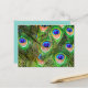 Postcard featuring a close up of the beautiful shimmering eyespots on a peacock's train, highlighting the iridescent green, blue and bronze details of these tail feathers. Great card for bird and nature lovers. Photo taken at Arcadia, California.