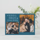 Minimal and modern holiday photo template card featuring 2 photos with a text that says "shining bright together" with stars. You can also add another picture and message on the back. The background is teal.