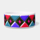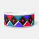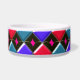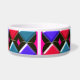 This awesome pet bowl has an abstract pattern with rows of red, light blue and dark blue diamonds on it. Each row is separated by a row of black diamonds. Each of the black diamonds has a hole in the middle of it. The top left of every single diamond looks like it is glistening. Here is the fun bit, you can fill in that hole with a choice of over 200 colours to make a unique design. Here the holes have been filled with a piercing bright pink colour as an example. To select your colour and see the effect it has on the design simply click on the “customise it” button, go to the colours section and click on background then select whichever colour you would like to put into the design. You can try as many colours as you like until you find the one that works for you.