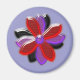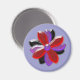 This pretty magnet features a digital image of a daisy flower with purple, red and black coloured petals with a purple centre. The petals look like they are made of shining plastic that has caught the light and caused an iridescent effect. The background is a calming blue colour.