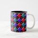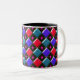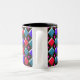 This brilliant shining diamonds mug has an abstract pattern with rows of red, light blue and dark blue diamonds on it. Each row is separated by a row of black diamonds. Each of the black diamonds has a hole in the middle of it. The top left of every single diamond looks like it is glistening. Here is the fun bit, you can fill in that hole with a choice of over 200 colours to make a unique design. Here the holes have been filled with a piercing bright pink colour as an example. To select your colour and see the effect it has on the design simply click on the “customise it” button, go to the colours section and click on background then select whichever colour you would like to put into the design. You can try as many colours as you like until you find the one that works for you. The design is shown here on a two tone mug with a black interior but is also available on lots of other styles of mugs including travel mugs and beautiful frosted glass mugs.