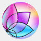 Round stickers featuring a shiny vector flower in pink, cyan and violet against a bright multicolored background.