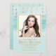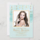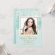 A beautiful design featuring an abstract, light teal background with hanging gold stars and a framed square photo window. This invitation is suitable for any age and either gender.
