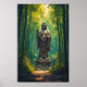 Bathed in a golden, ethereal light, this artwork invites you into a tranquil Japanese bamboo forest. Towering stalks of vibrant green form a natural cathedral, their leaves rustling softly in the breeze. At the heart of this serene grove, a magnificent Buddha statue stands as a beacon of peace and ancient wisdom. A winding path of sun-dappled stone leads towards the statue, beckoning the viewer on a journey of quiet contemplation. The overall scene is one of profound stillness, where the sacred and the natural worlds meet in perfect harmony.