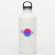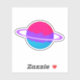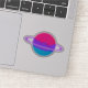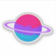 Digital art of a shiny planet in the colours of the androgyne flag surrounded by rings like Saturn in outer space.