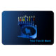 A modernistic, metallic, blue Chanukkah menorah, featuring a lion in silhouette, against a dark, night-like background. All nine of the candles are lit. Add your own text.