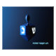 A modernistic, metallic blue dreidel against a dark, night-like background. Two of the Hebrew letters found on a dreidel, nun and shin, glow brightly. Hebrew text reading "Chag Chanukkah Sameach" (Happy Hanukkah) also appears in glowing blue and white.